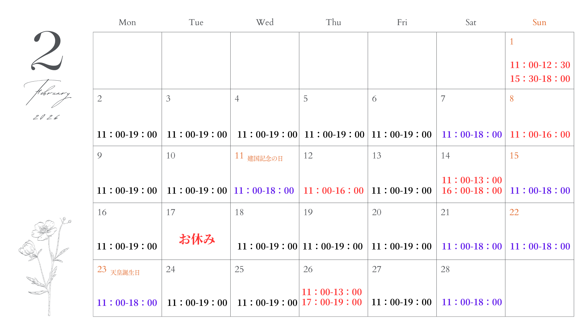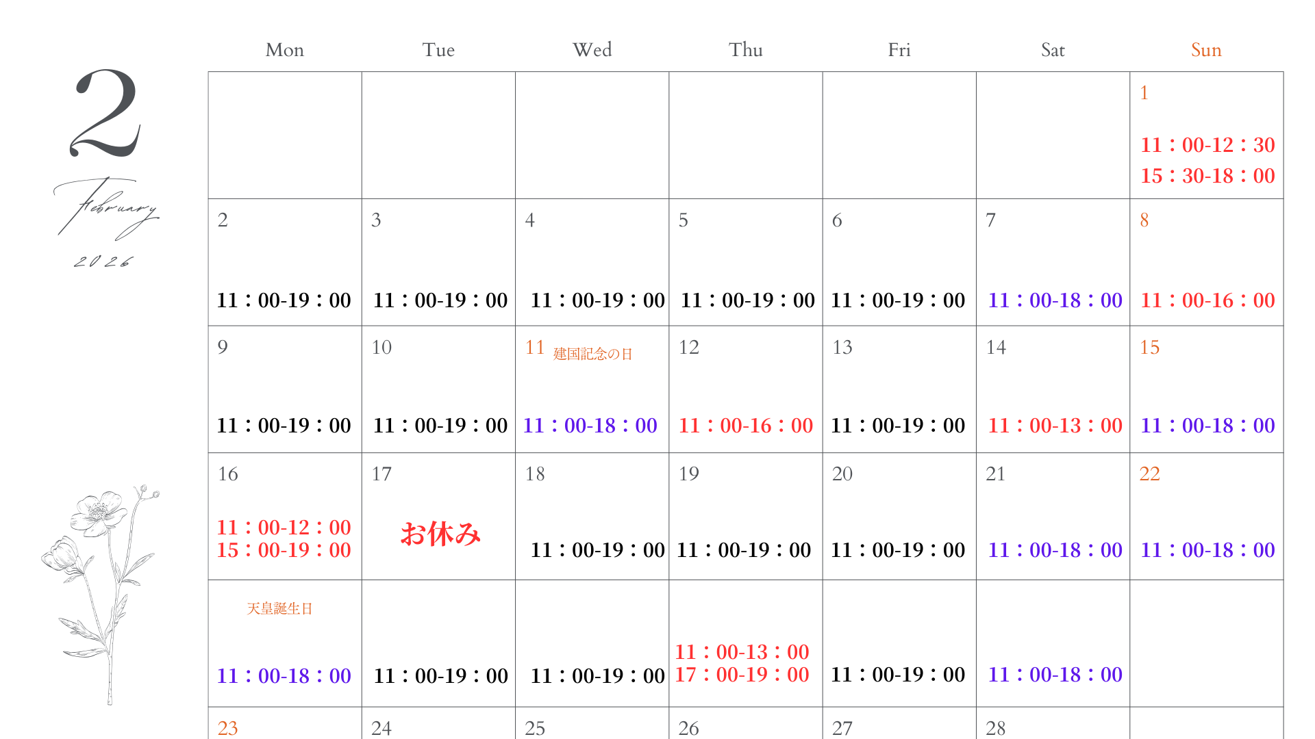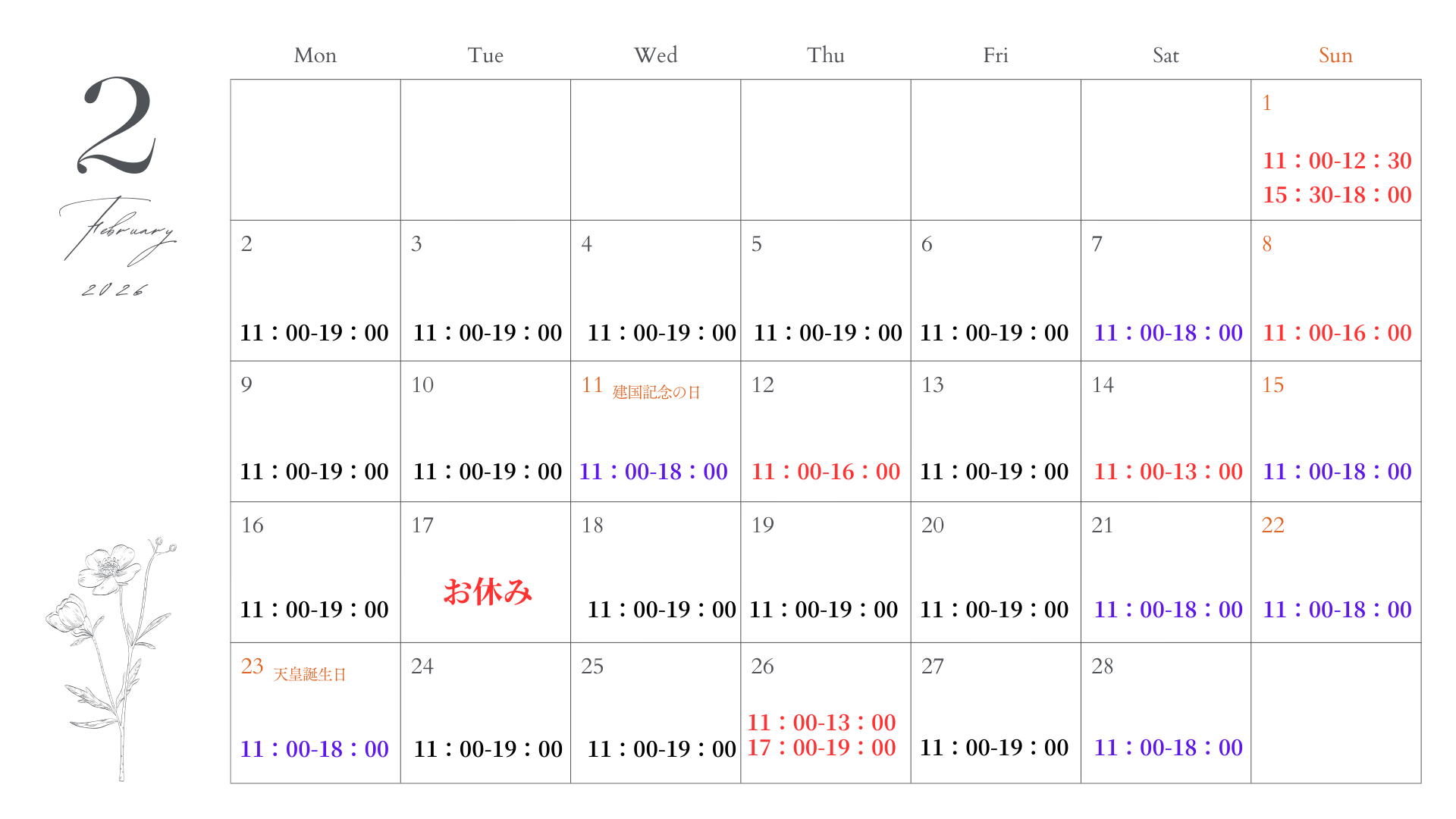 土日祝 11:00 ~ 18:00