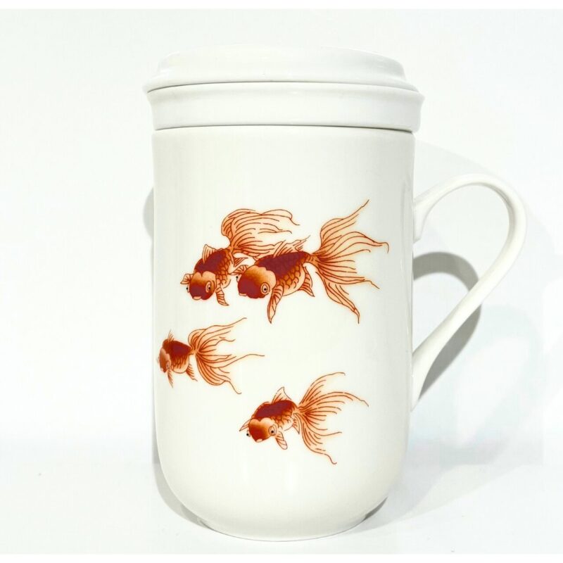 台湾の茶器専門店「風清堂」が手がけた、金魚柄の茶こし付きマグカップ。白磁の器に描かれた八匹の金魚は、朱色の尾をたなびかせながら、まるで水の中を舞っているかのよう。流れるような筆致と余白の美が、器に涼やかな気配を添えます。