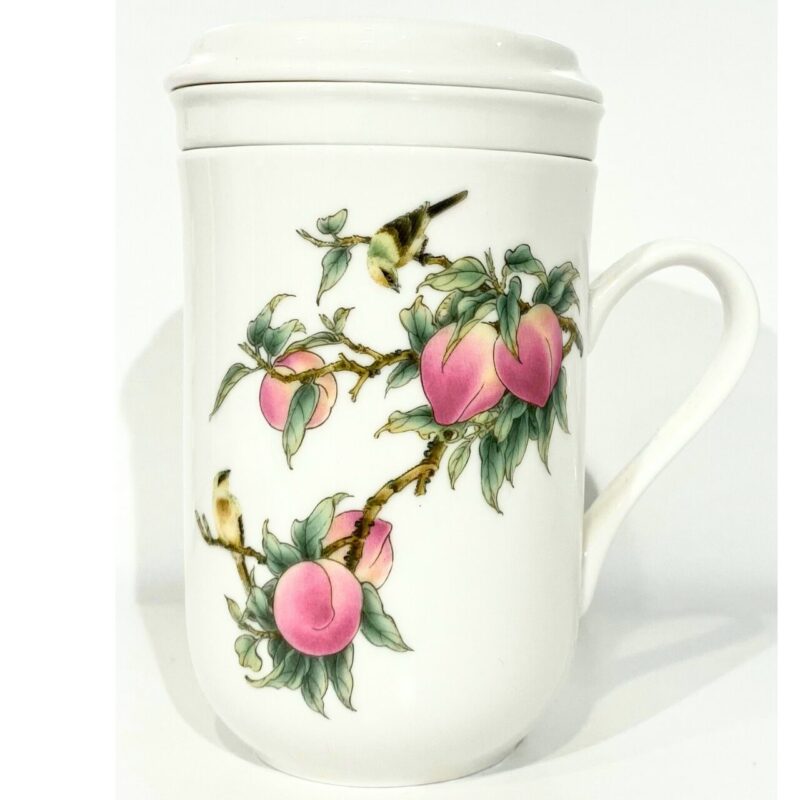 台湾の茶器専門店「風清堂」が手がけた、桃柄の茶こし付きマグカップ。白磁の器に描かれた桃の実は、瑞々しく、枝に宿る生命力を感じさせます。中国文化では「寿桃」と呼ばれ、長寿や吉祥の象徴として親しまれてきたモチーフです。