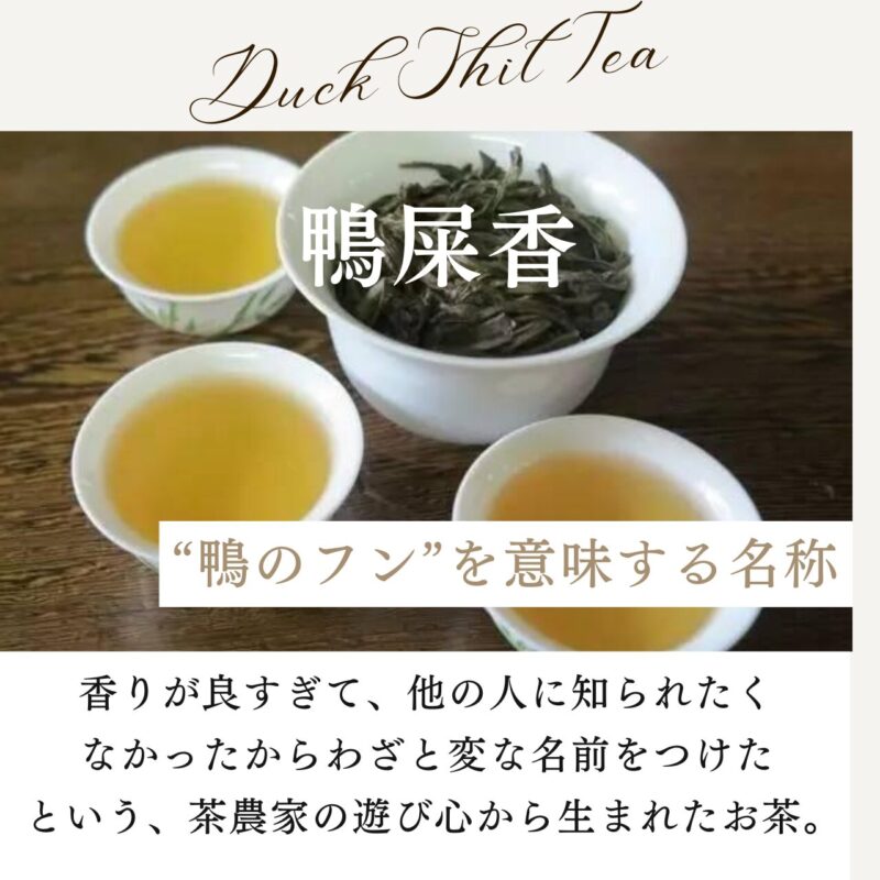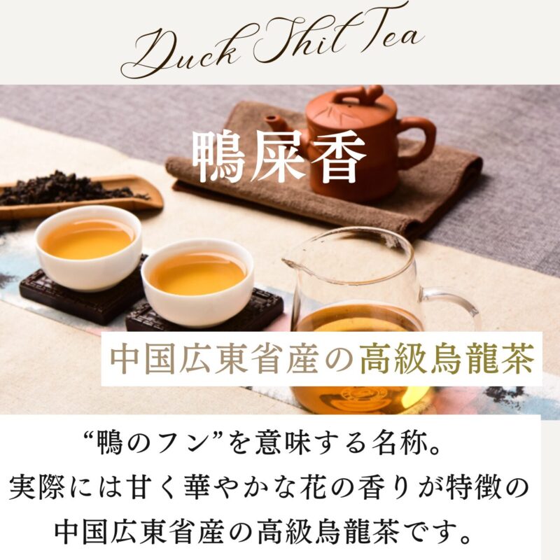 “鴨のフン”を意味する名称。実際には甘く華やかな花の香りが特徴の中国広東省産の高級烏龍茶で、香りが良すぎて、他の人に知られたくなかったからわざと変な名前をつけた という、茶農家の遊び心から生まれたお茶。  品種:鳳凰水仙